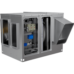 This unit offers many configurations and is designed for easy installation on rooftops or outdoor ground pad mounting. Weatherproof, double-wall insulated housing with hinged access doors allows for easy access to the unit’s wheel, filters, motors, and controls. An optional BMS integration and wheel economizer are also available.